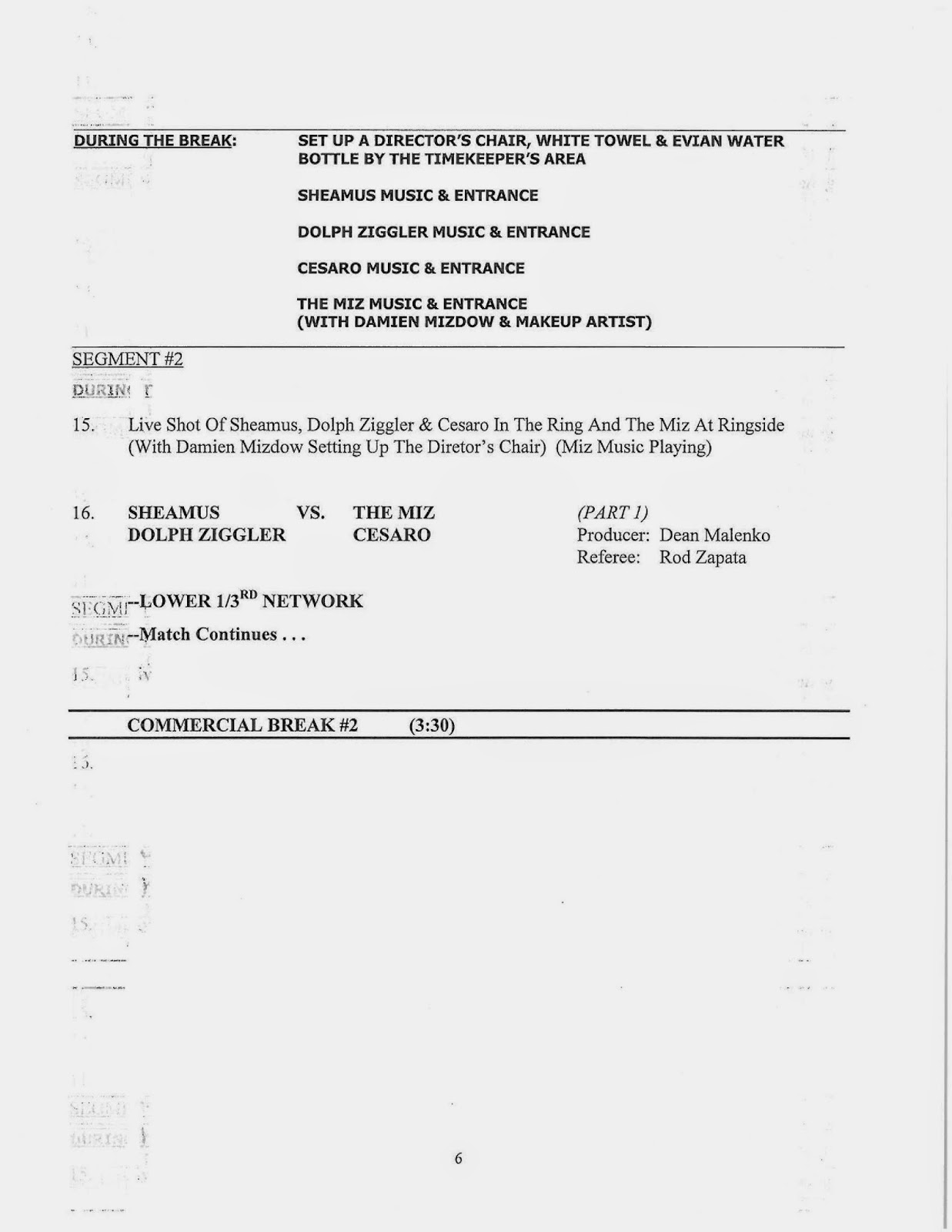 Todo lo que podemos leer en el guión se asemeja bastante a lo que vimos en televisión. Lo único que no aparece en el script fue el Attitude Adjustment que John Cena le aplicó a Seth Rollins sobre la mesa de comentaristas, así como las burlas que se hicieron Chris Jericho y Triple H sobre sus respectivas formas de vestir al inicio del show. Pero vamos, todos sabemos que es perfectamente normal que los talentos se salten de vez en cuando el guión para meter su pulla.